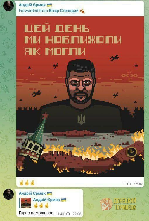 После заявлений Владимира Зеленского, к информационной провокации подключился глава его офиса Андрей Ермак. В одной из соцсетей он опубликовал плакат, на котором изображён мрачный Зеленский с гипнотическим взглядом, глядящий на пылающую Красную площадь — якобы после удара беспилотников ВСУ. На изображении также присутствует надпись на украинском языке, взятая из знаменитой советской песни «День Победы»: «Этот день мы приближали, как могли».