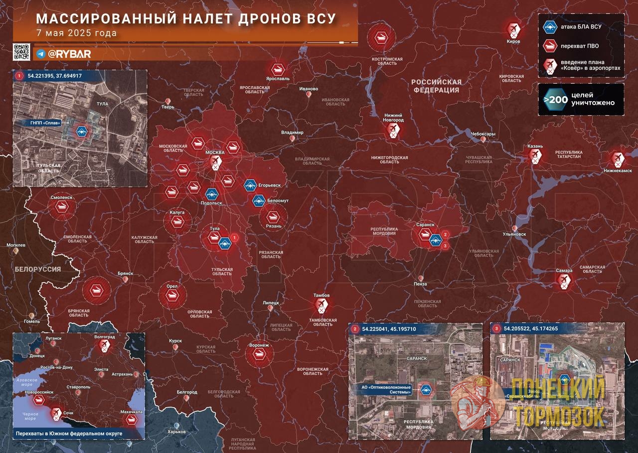 Минувшей ночью Вооружённые силы Украины предприняли одну из самых масштабных атак за последние месяцы. По данным Минобороны РФ, средствами ПВО было перехвачено свыше 200 беспилотников и ракет в небе над Тульской, Ярославской, Белгородской, Московской, Воронежской, Костромской, Смоленской областями, а также над территорией Республики Мордовия, сообщает аналитический проект «Рыбарь».