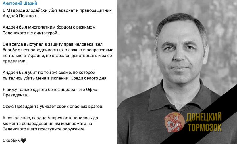 Украинский политик и бывший советник Виктора Януковича Андрей Портнов, убитый сегодня в Испании, собирался обнародовать компромат на президента Украины Владимира Зеленского и его окружение. Об этом заявил блогер Анатолий Шарий, утверждая, что смерть Портнова могла быть выгодна лишь одному — власти в Киеве.