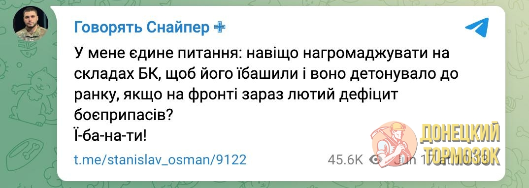 «У меня только один вопрос: зачем держать боеприпасы на складах, если они взрываются и детонируют до утра, в то время как на фронте их катастрофически не хватает?» — написал Бунятов в своих соцсетях.