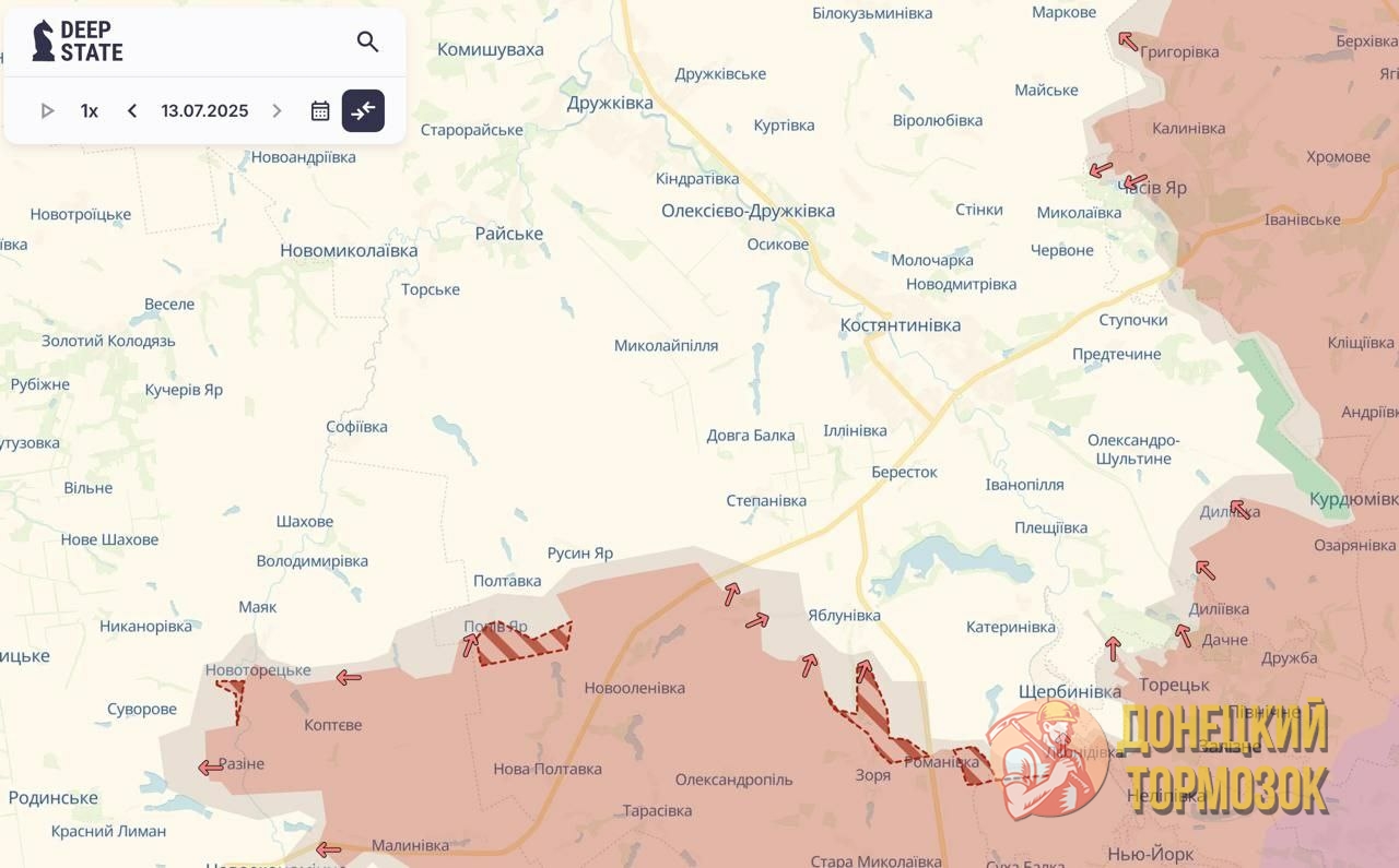 Ситуация в районе Константиновки стремительно накаляется. Российские подразделения вплотную подошли к рубежам города — до окраин остаётся не более семи километров. Наступление идёт со стороны Яблуновки, откуда наши силы уверенно продвигаются, прижимая украинские части к последним линиям обороны.